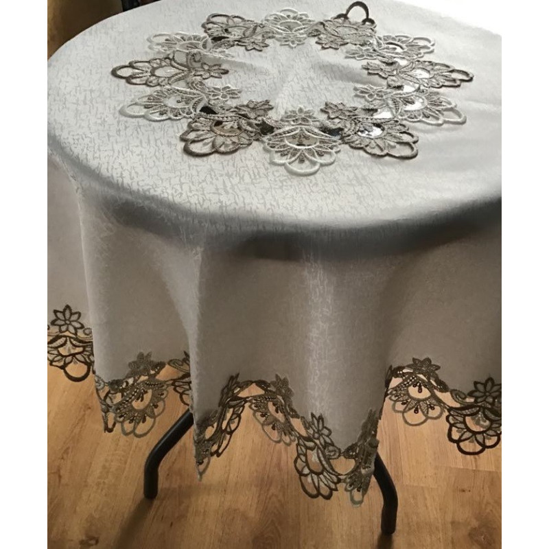 Elegancki i praktyczny obrus okrągły zdobiony koronką gipiurową. Gipiura wszyta jest w części środkowej obrusu oraz doszyta na jego brzegach. Obrus wykonany z tkaniny poliestrowej o podwyższonej gramaturze w kolorze jaśniutkim ekri z drobnym marmurkowym wzorem obszyty beżową gipiurą.