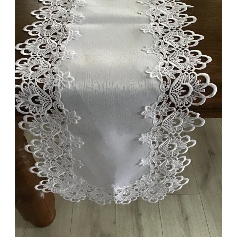 Elegancki bieżnik biały obszyty ładną i wytrzymałą gipiurą.