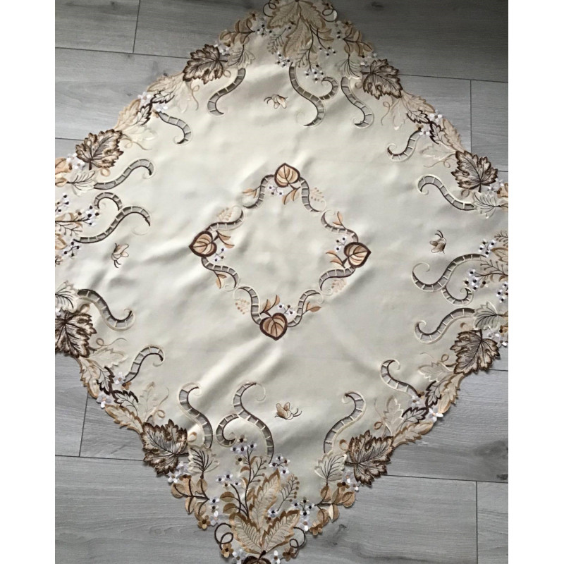 Eleganckie bieżniki i serwety haftowane. Wykonane z poliestru z pięknymi haftami. Kolor kremowy w brązowe hafty.