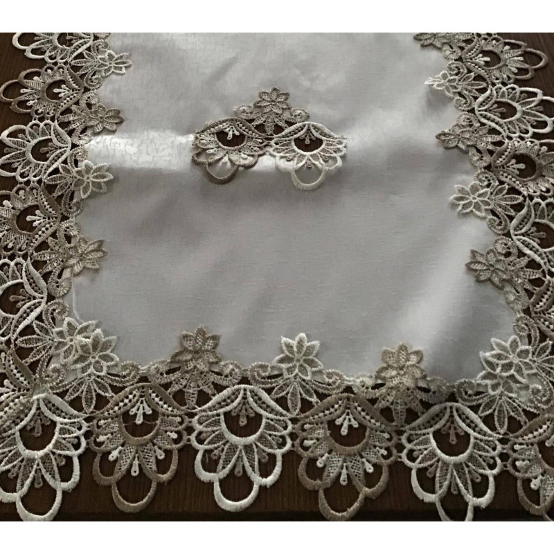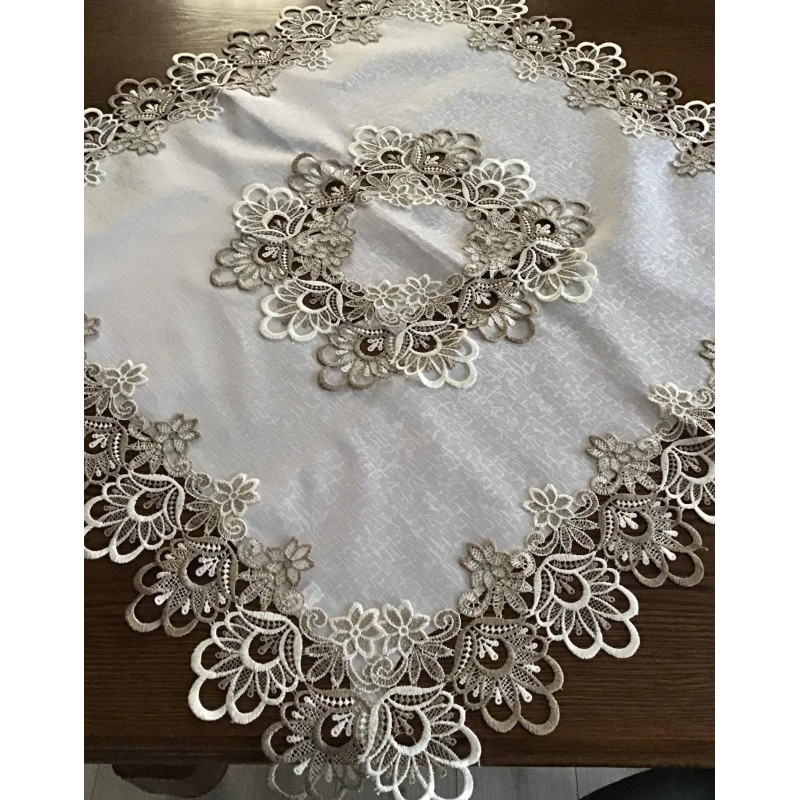 Eleganckie bieżniki i serwety obszyte ładną i wytrzymałą gipiurą. Kolor jaśniutki ekri z beżową gipiurą.