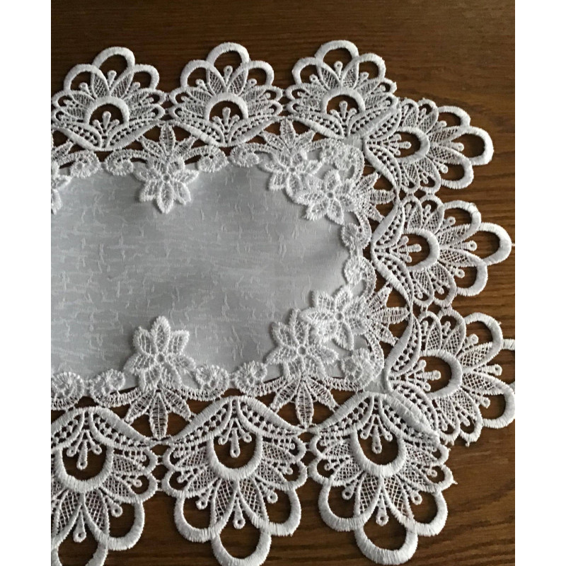 Piękne serwetki z tkaniny poliestrowej ozdobione elegancką i wytrzymałą gipiurą .