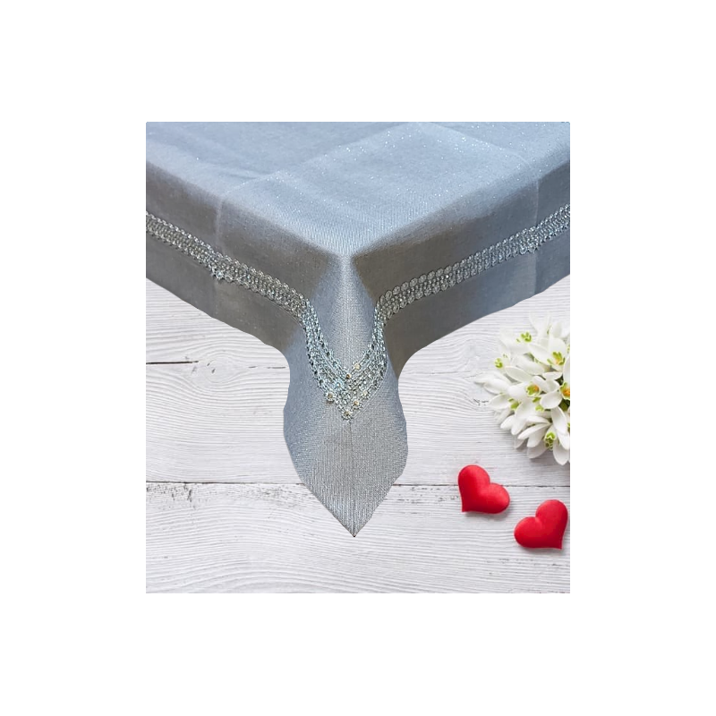 Elegancki obrus z cekinami . Wykonany z wysokogatunkowej tkaniny poliestrowej metalizowanej - srebrne świecące nitki .Kolor szary. Pięknie udekoruje każdy stolik, ławę czy stół w jadalni.