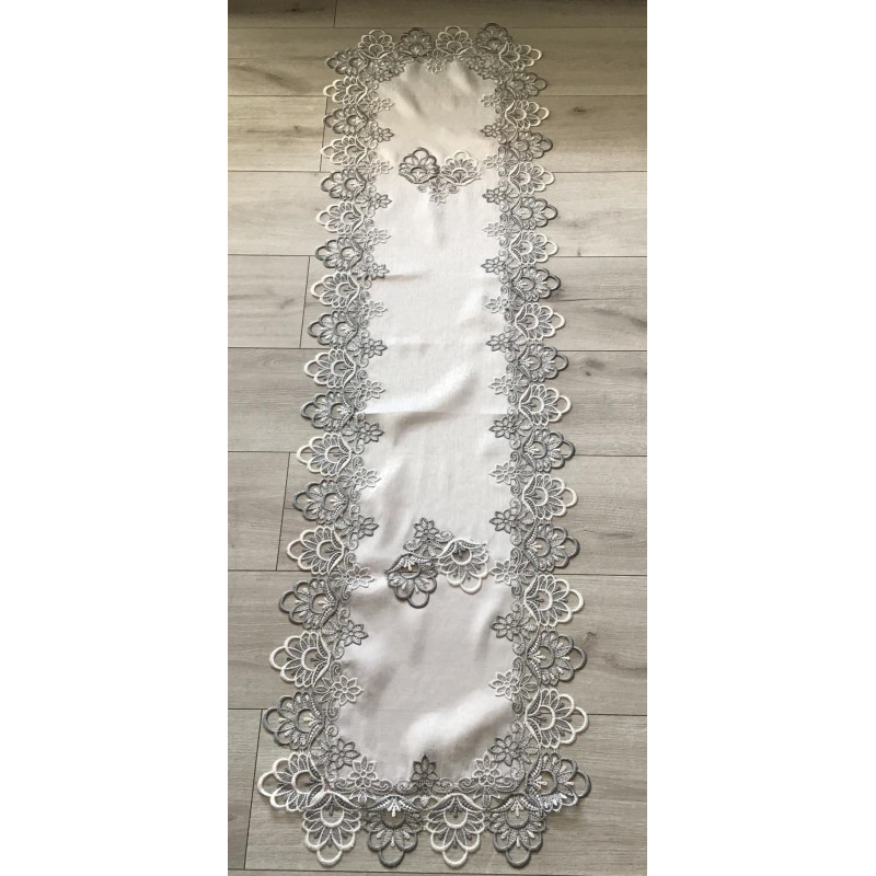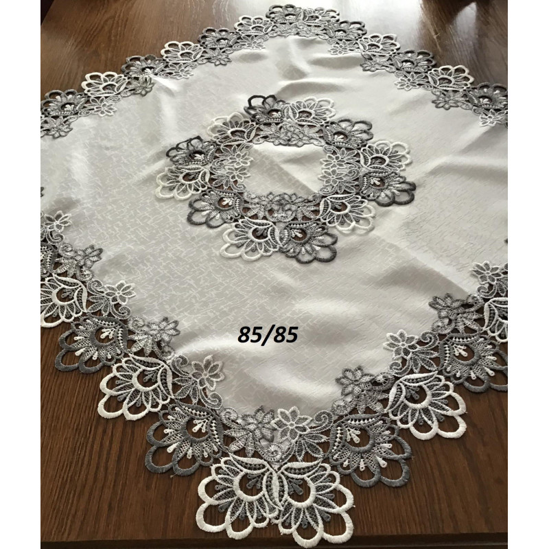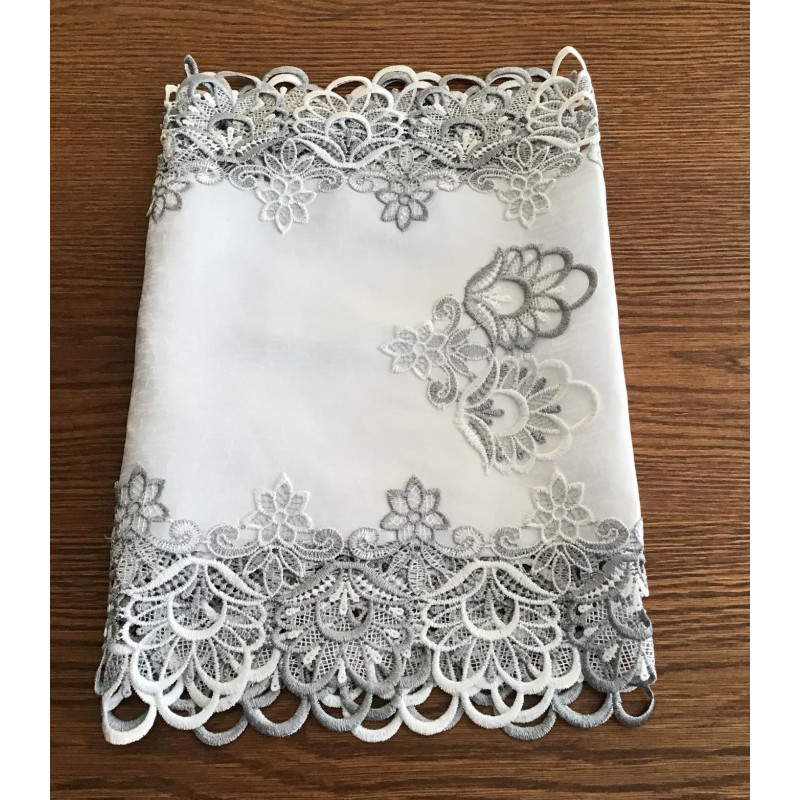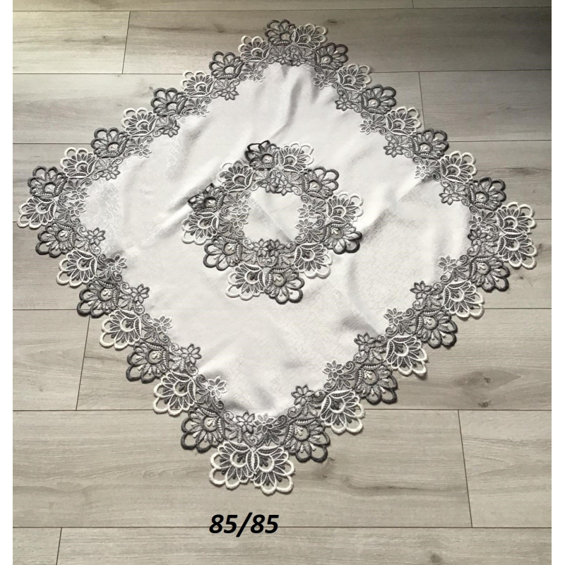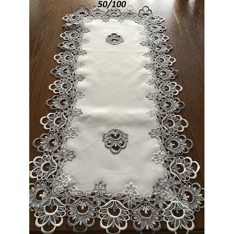 Eleganckie bieżniki i serwety obszyte ładną i wytrzymałą gipiurą. Kolor biały z szarą gipiurą.