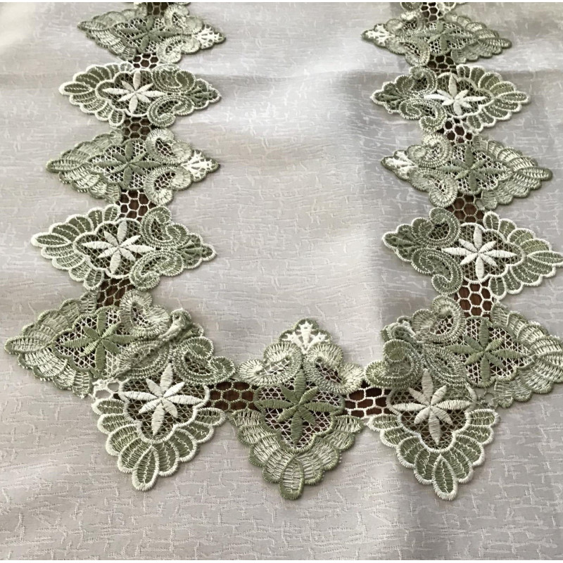 Elegancki i praktyczny obrus wykończony ładną i wytrzymałą gipiurą . Świetnie prezentuje się na każdym stole . Tkanina poliester . Kolor biały obszyty zieloną gipiurą. Występuje w różnych rozmiarach .