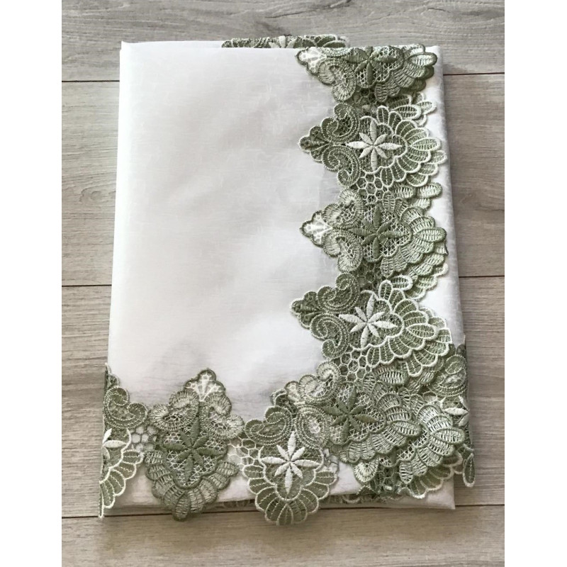 Obrus Biały Obszyty Elegancką Zieloną Gipiurą
