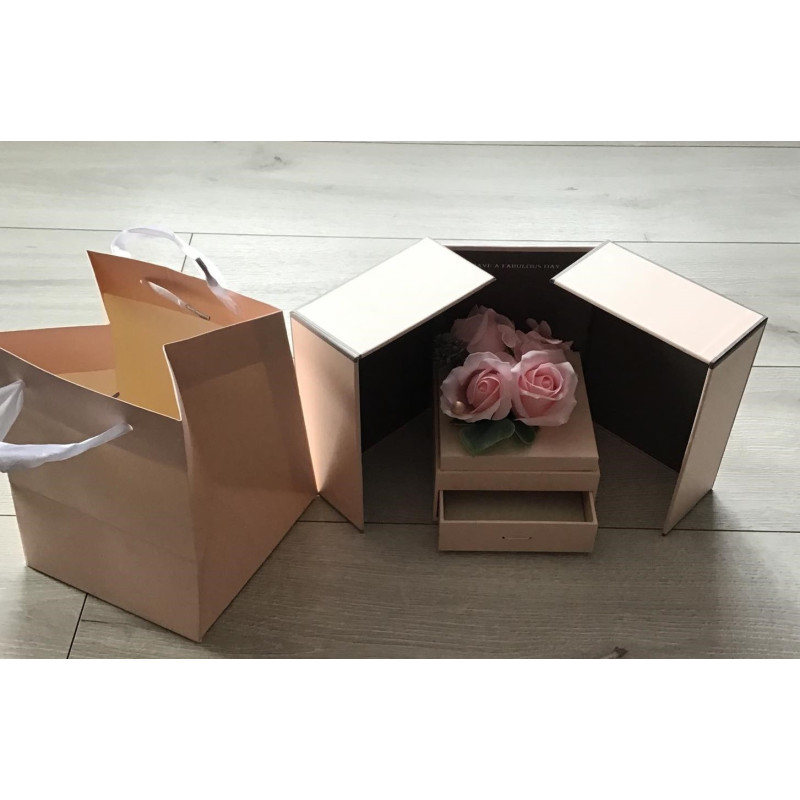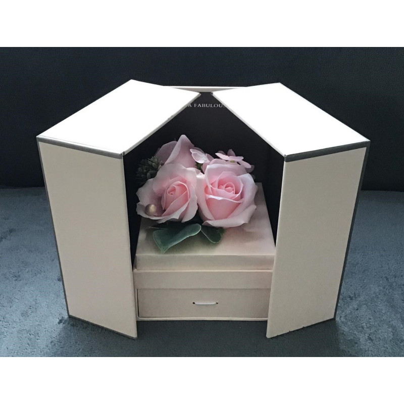 Szkatułka z mydlanymi , pachnącymi różyczkami w eleganckim składanym kartonie . Wysuwana szkatułka na jakiś drobiazg.