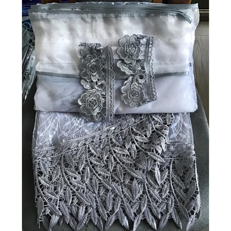 Firana gotowa uszyta ze śnieżnobiałej tkaniny w delikatną krateczkę z haftowanymi kwiatami . Obszyta elegancką szarą gipiurą . Firana układa się w dwa kokony.