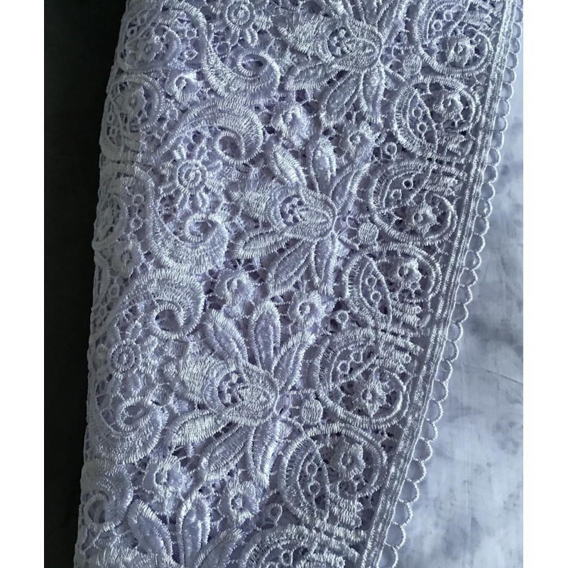 Firana gotowa uszyta ze śnieżnobiałego woalu . Obszyta elegancką gipiurą. Uszyta w łuk.