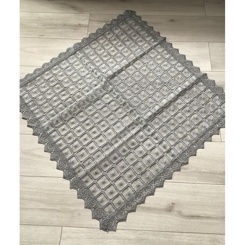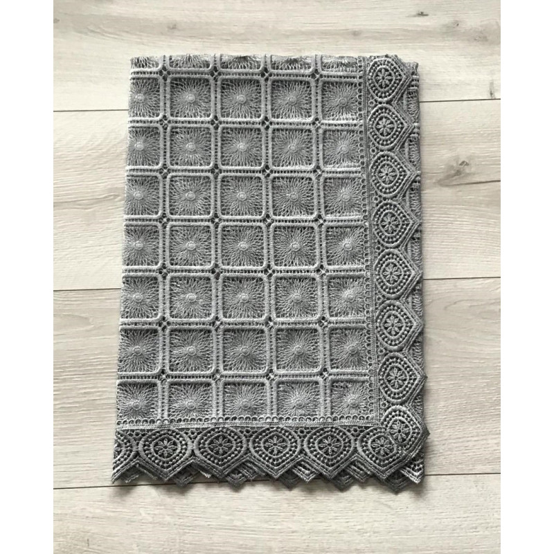 Eleganckie bieżniki i serwety całe z gipiury w szare kwadraty.