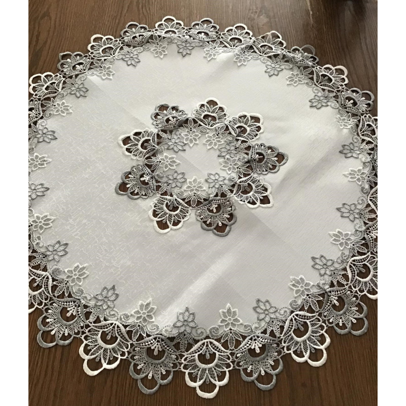 Obrus okrągły biały zdobiony szarą koronką gipiurową KY1088A/RD