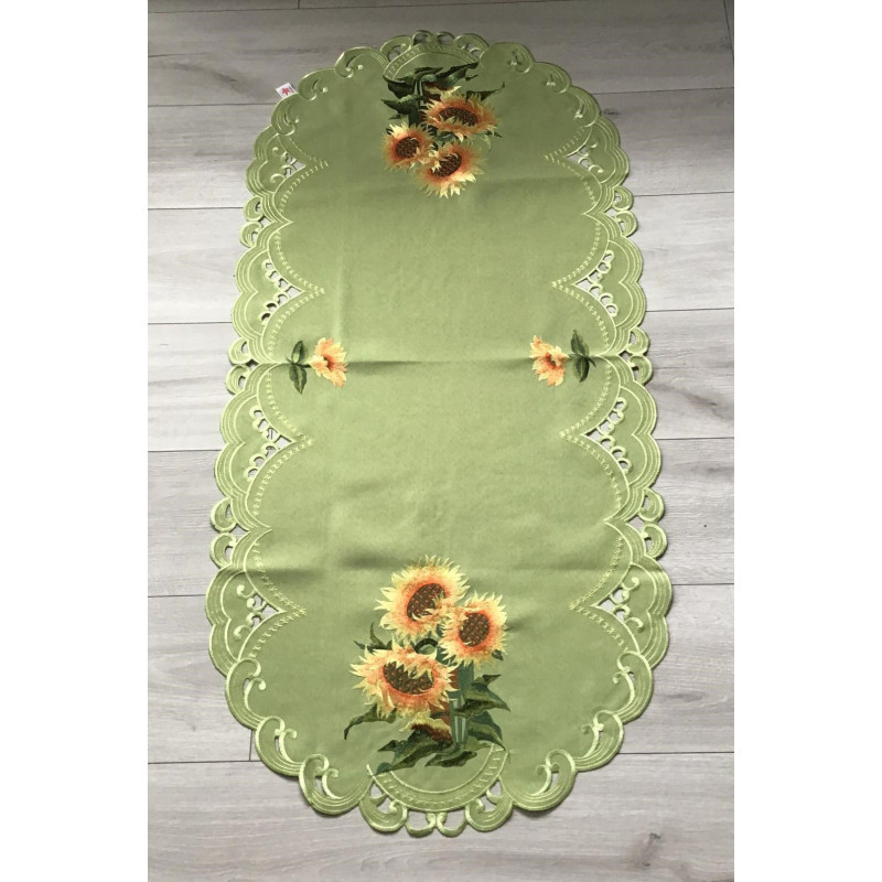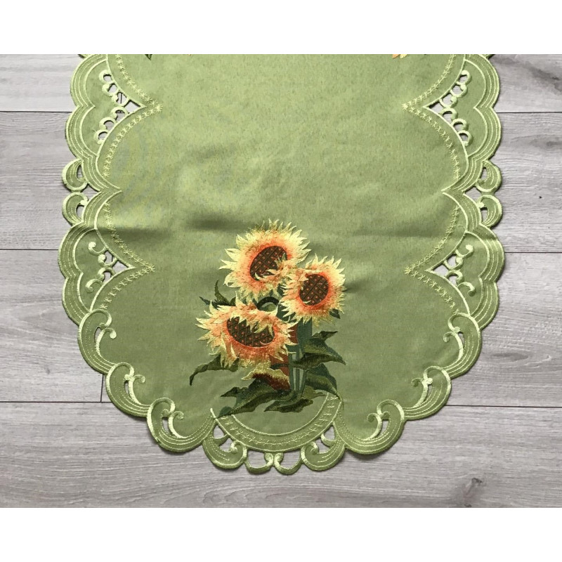 Eleganckie bieżniki i serwety haftowane. Wykonane z poliestru z pięknymi haftami. Kolor zielony w żółte słoneczniki.