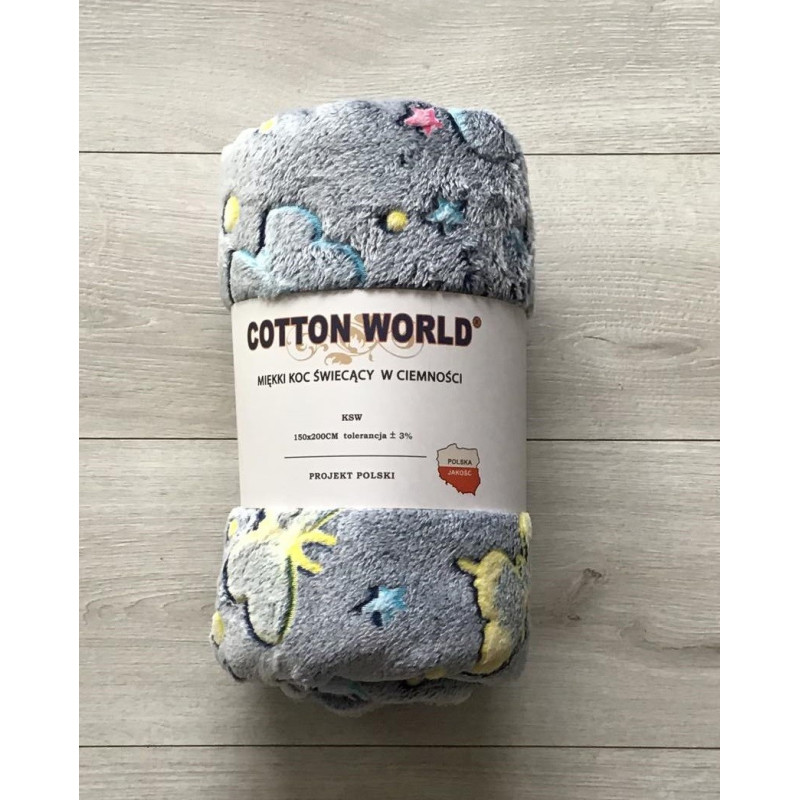 Koc świecący w ciemności Fluo. Mięciutki i przyjemny w dotyku. W ciągu dnia kocyk wygląda jak każdy inny , natomiast gdy zapadnie zmrok zaczyna świecić zachwycającym blaskiem a dzieje się tak dzięki zastosowaniu nici fluorescencyjnych. Delikatna kolorystyka idealnie odnajdzie się w każdej sypialni lub w pokoju każdego malucha.