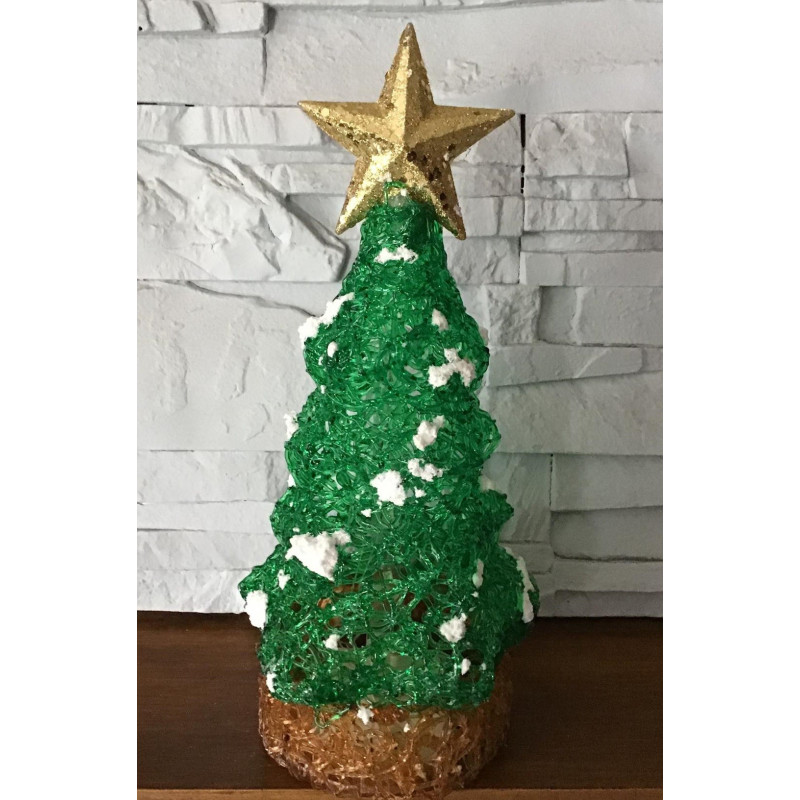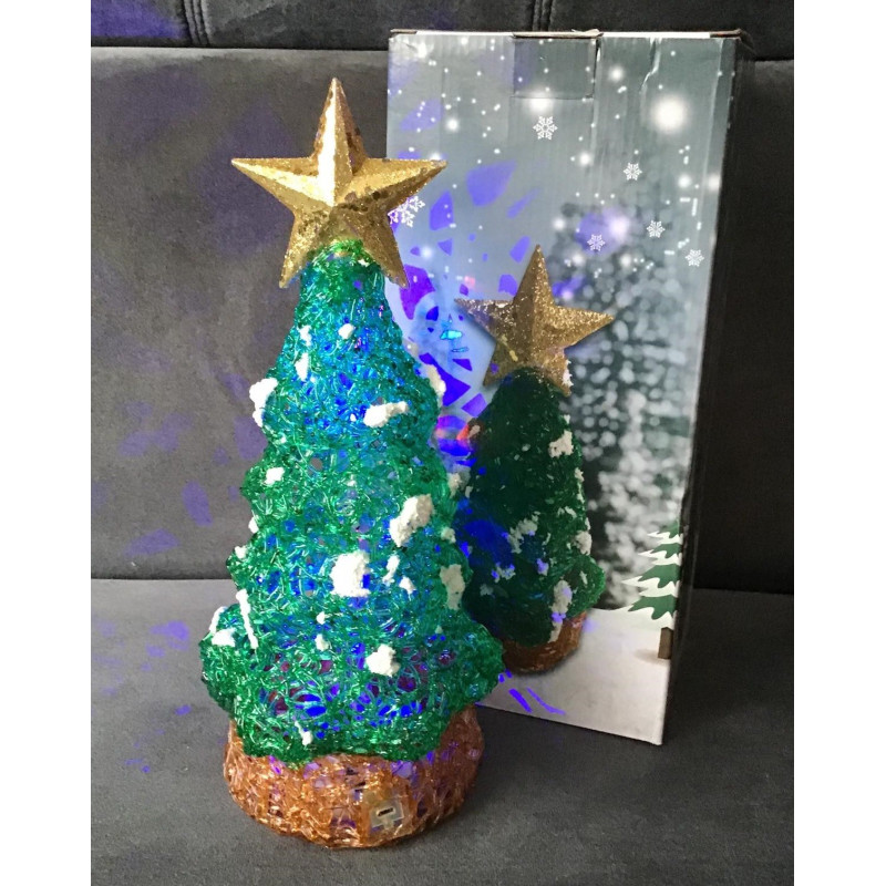 Lampion choinka wykonana ze sztucznego tworzywa w kolorze zielonym z białą imitacją śniegu. Lampion podświetlany ciepłym światłem ledowym zmieniający kolory.