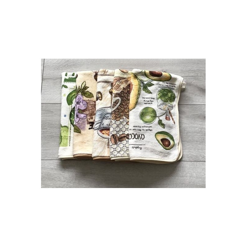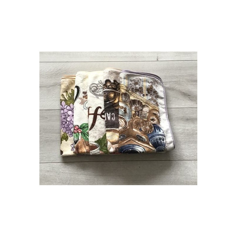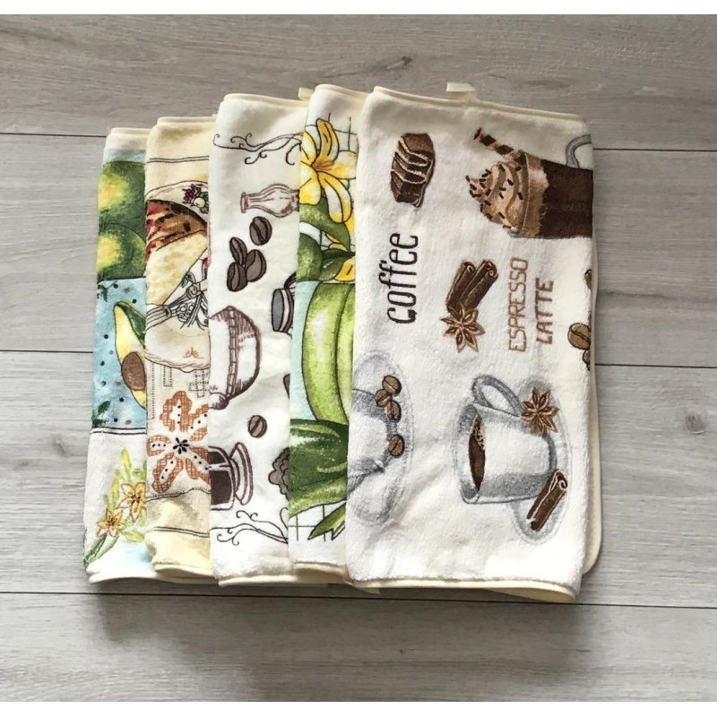 Zestaw ręczników z grubej mięciutkiej mikrofibry z motywami kuchennymi , owocami. Niezastąpione dla każdej gospodyni. Chłonne i praktyczne w kuchni.