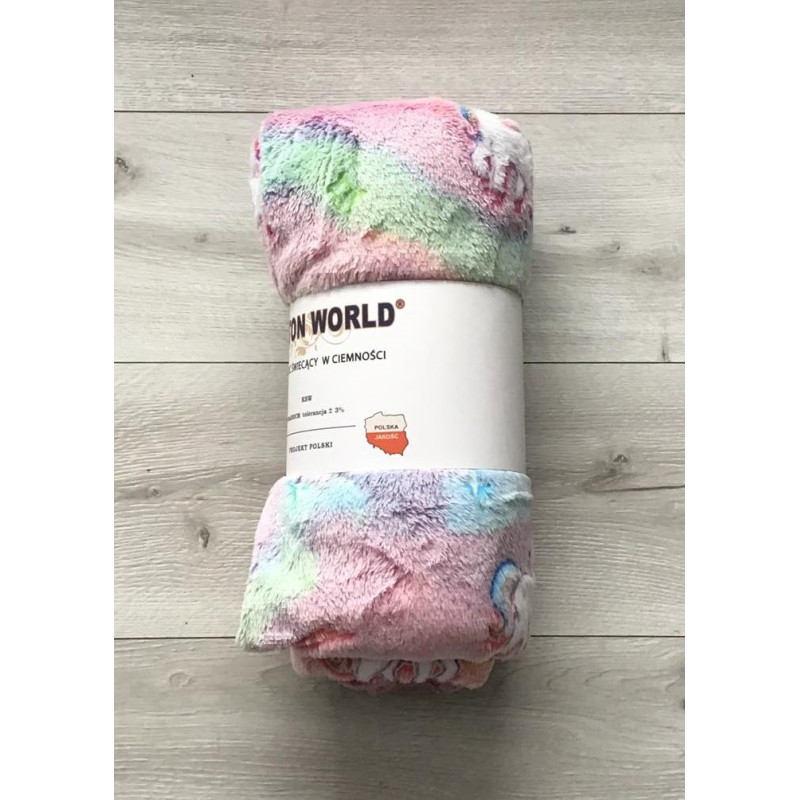 Koc świecący w ciemności Fluo. Mięciutki i przyjemny w dotyku. W ciągu dnia kocyk wygląda jak każdy inny , natomiast gdy zapadnie zmrok zaczyna świecić zachwycającym blaskiem a dzieje się tak dzięki zastosowaniu nici fluorescencyjnych. Delikatna kolorystyka idealnie odnajdzie się w każdej sypialni lub w pokoju każdego malucha.
