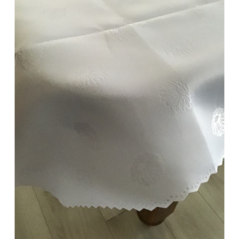 Elegancki i praktyczny obrus plamoodporny. Biały z różnymi wzorkami.