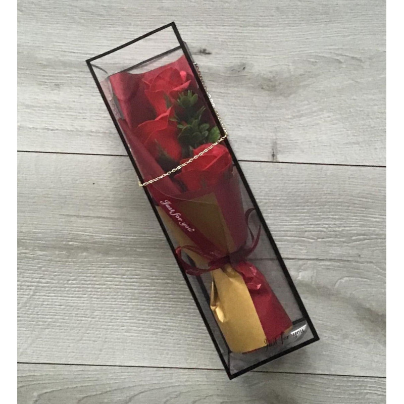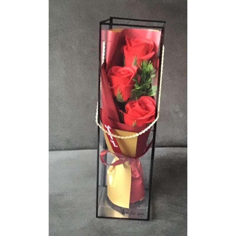Bukiet składający się z trzech czerwonych róż w przezroczystym pudełeczku. Sztuczne róże o naturalnym wyglądzie to doskonała alternatywa dla kwiatów świeżych stanowią elegancki i ciekawy akcent we wnętrzu. Swiatełka led o trzech trybach świetlnych w multikolorze nadadzą wyjątkową atmosferę w otoczeniu .