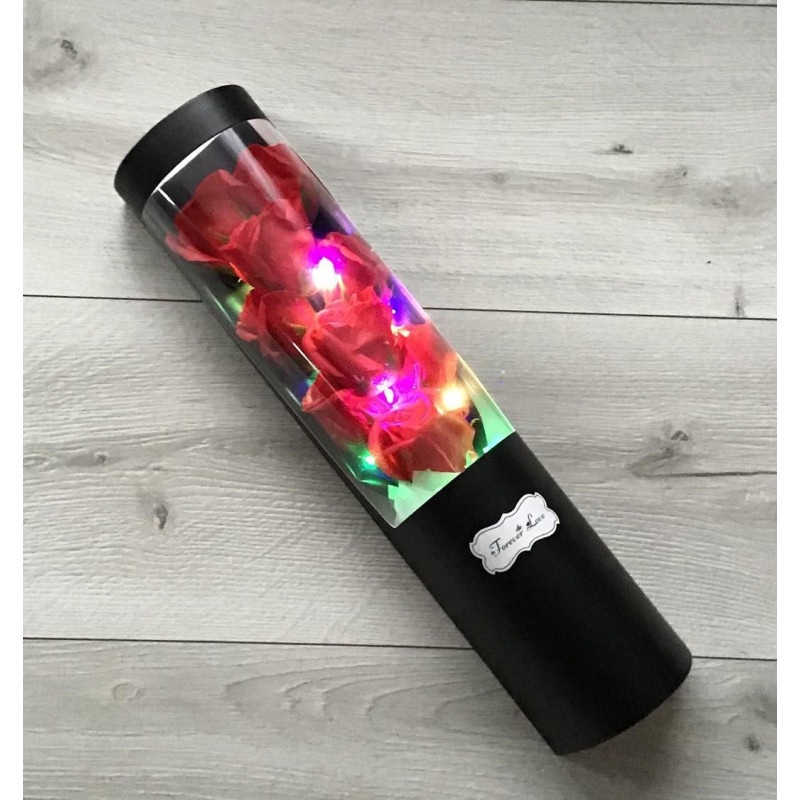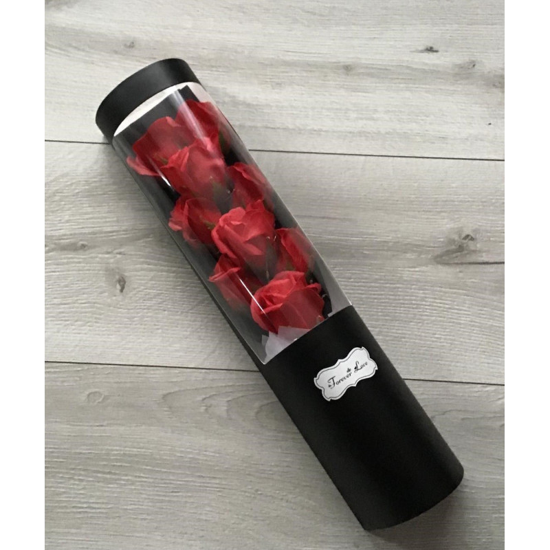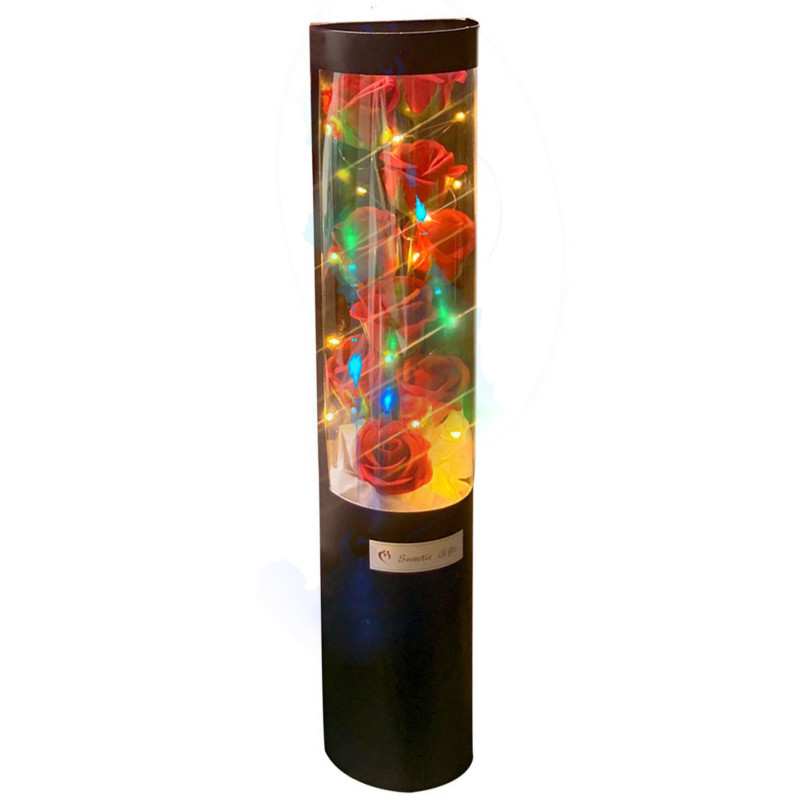 Bukiet składający się z 9 czerwonych róż w przezroczystej tubie. Sztuczne róże o naturalnym wyglądzie to doskonała alternatywa dla kwiatów świeżych stanowią elegancki i ciekawy akcent we wnętrzu. Swiatełka led o trzech trybach świetlnych w multikolorze nadadzą wyjątkową atmosferę w otoczeniu .