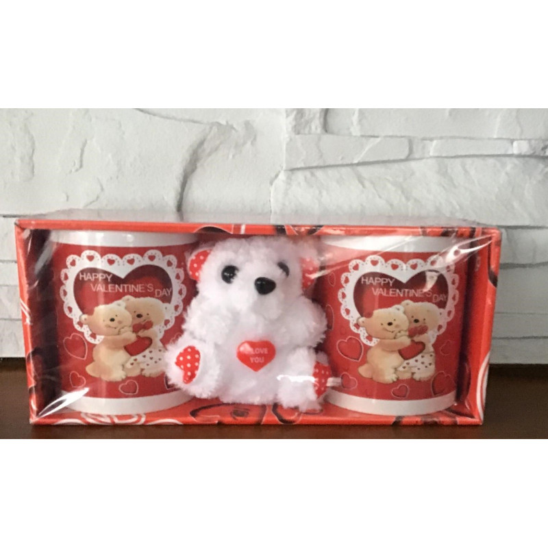 Zestaw 2 kubków ceramicznych z nadrukiem Walentynkowym o pojemności 300ml zapakowany w elegancki kartonik . W zestawie jest biały miś z serduszkiem.