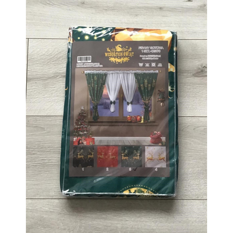 Firana gotowa z białego woalu z zielonym materiałem we wzór świąteczny. Składa się z czterech kokonów (dwóch zasłonek i dwóch firanek) ,spiętych kokardami na rzep. Firanka stanowi jeden element.