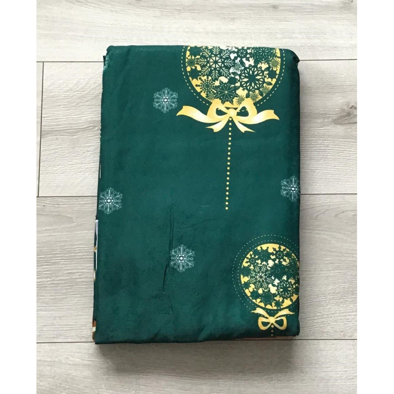 Biały woal z zielonym materiałem z wzorem świątecznym , żółte bombki i renifery.