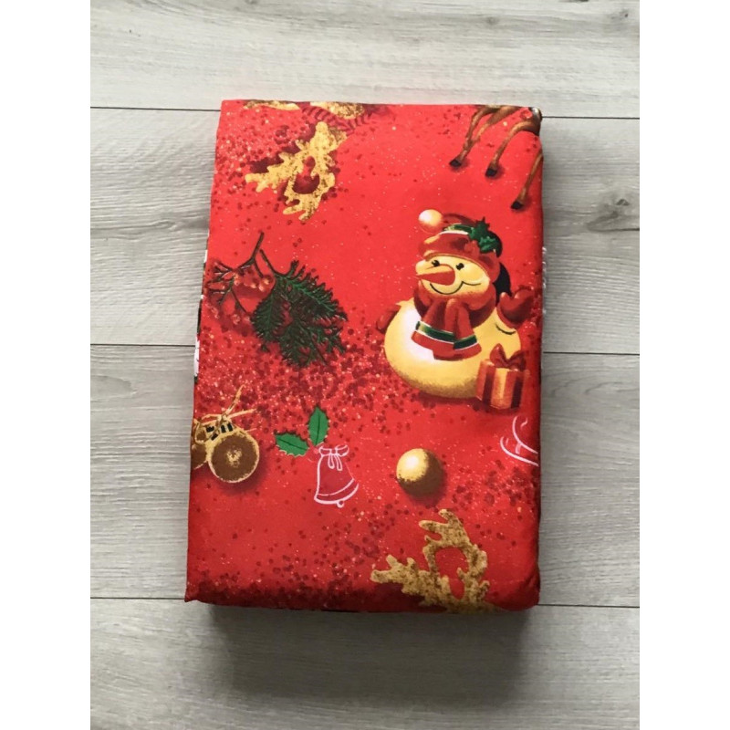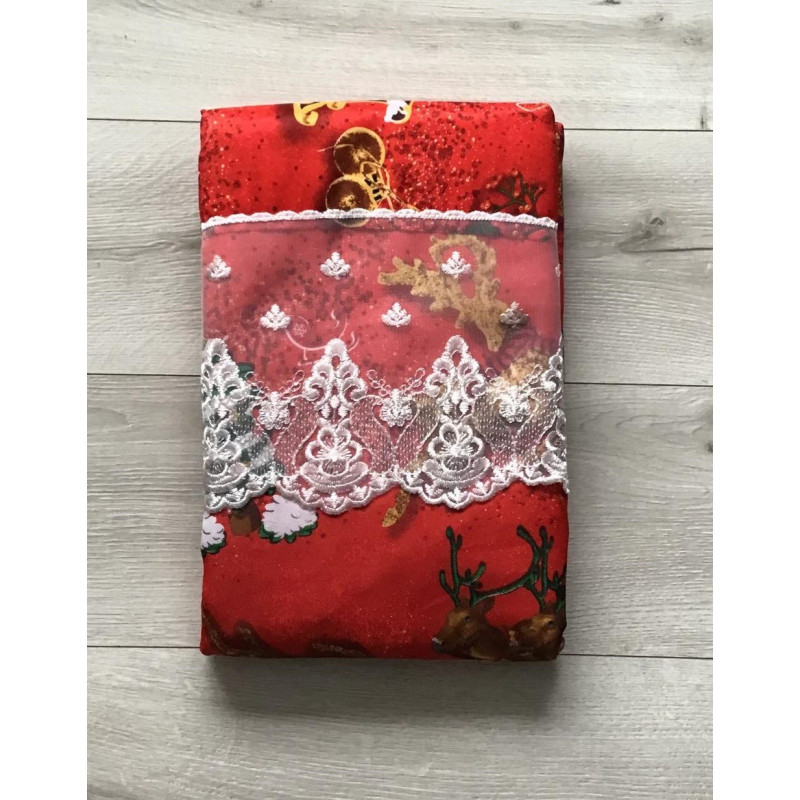 Biały woal z czerwonym materiałem z wzorem świątecznym.