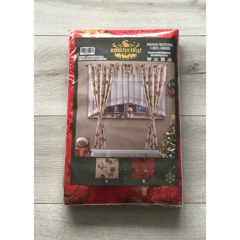 Firana gotowa z białego woalu z czerwonym materiałem we wzór świąteczny. Składa się z dwóch długich kokonów -zasłonek spiętych kokardami na rzep oraz firanki z białego woalu obszytego gipiurą Firanka stanowi jeden element , od góry jest lambrekin w kolorze i wzorze zasłon z doszytą białą gipiurą.