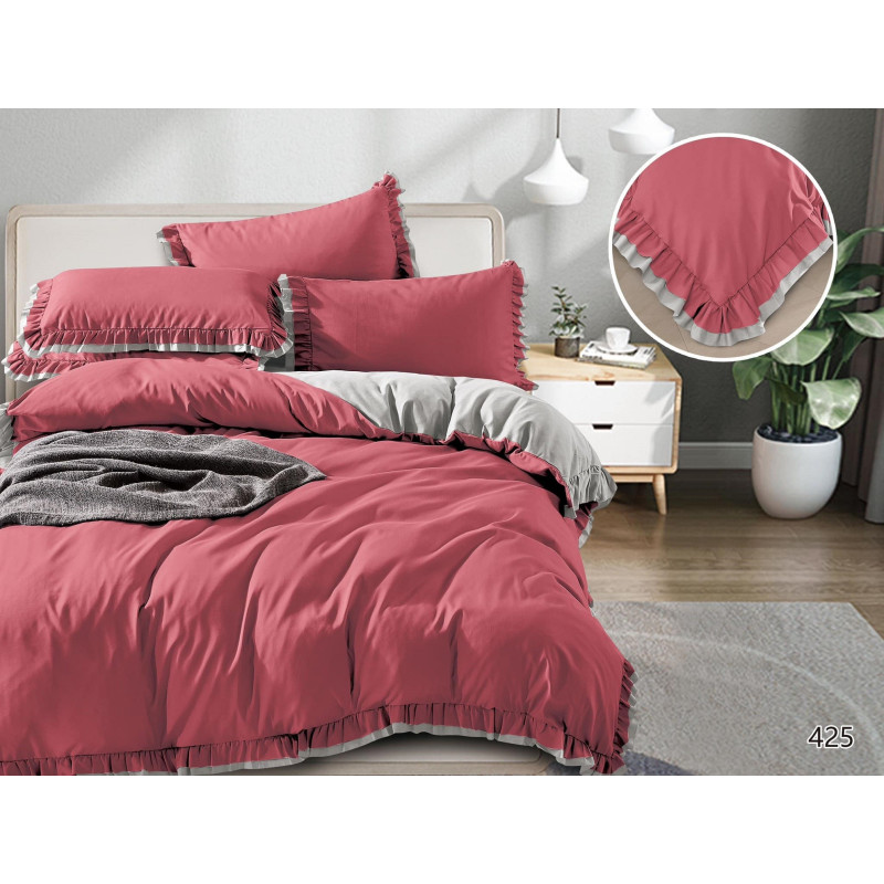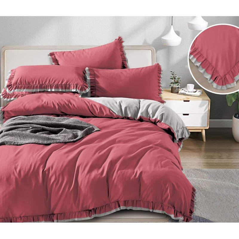 Pościel Z Dwukolorową Falbanką Satyna Bawełniana 160x200 Malinowo/Szara