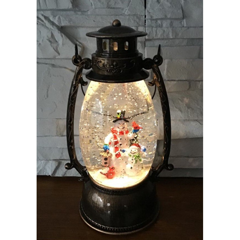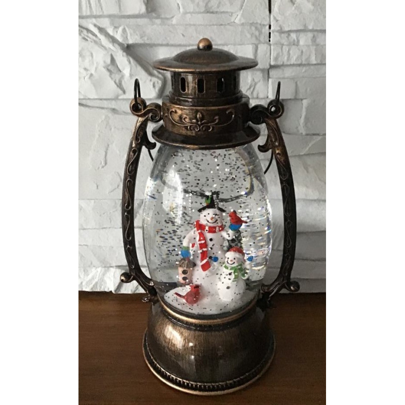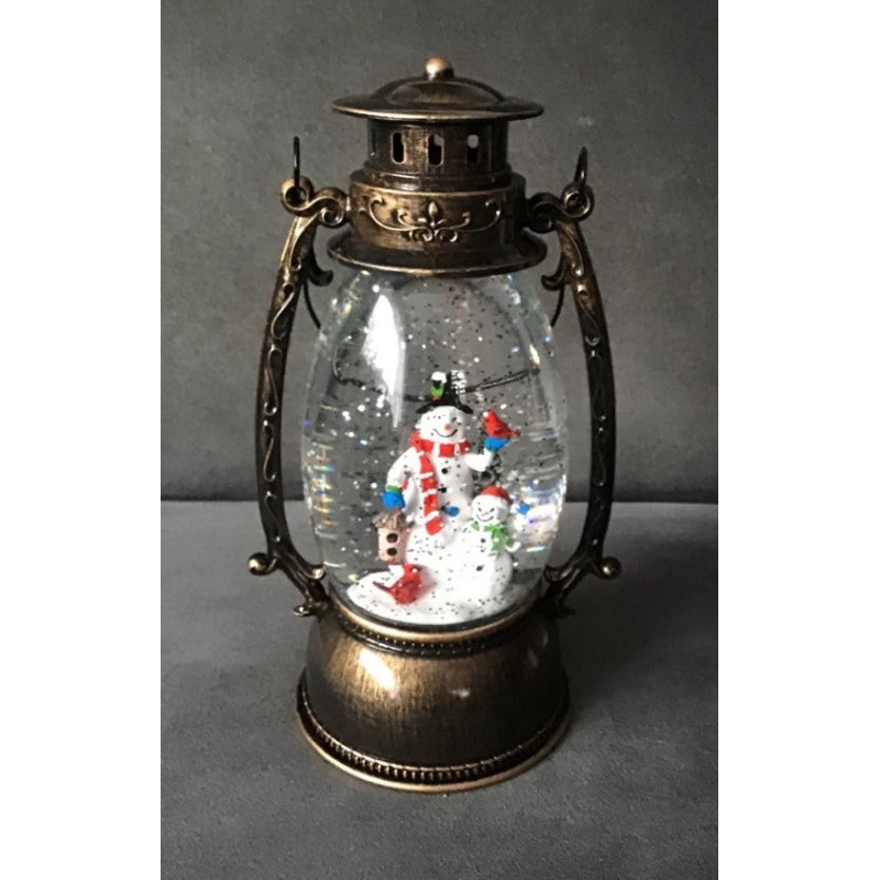 Lampion z figurkami świątecznymi w środku. Wykonany ze sztucznego tworzywa (imitacja metalu) w kolorze antycznego brązu. Lampion podświetlany ciepłym światłem ledowym. W środku znajduje się konfetii , które pięknie rozprasza światło i stwarza klimat padającego śniegu. Rozbrzmiewają również świąteczne melodie.