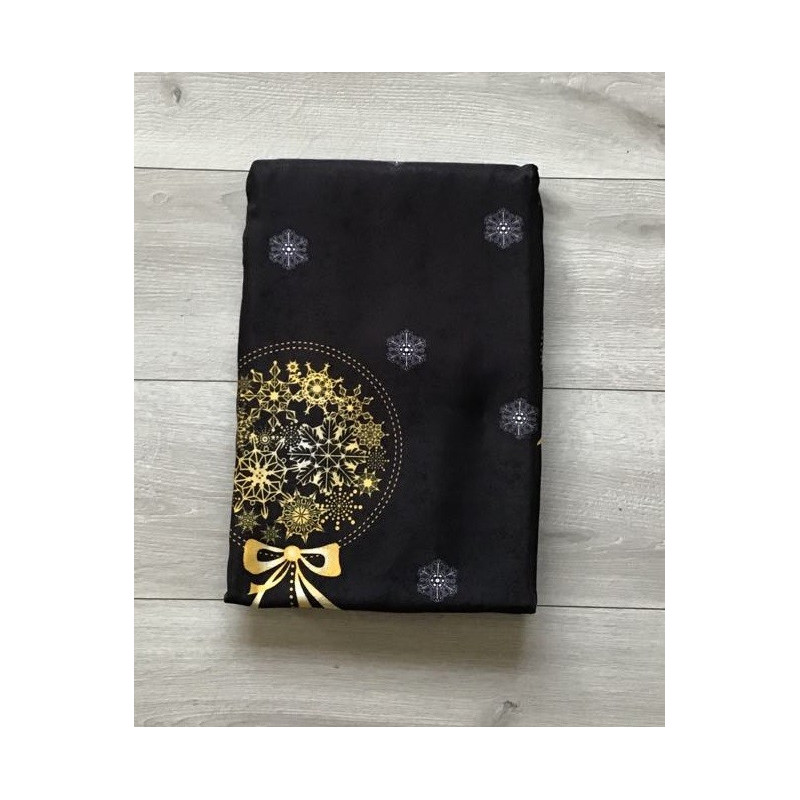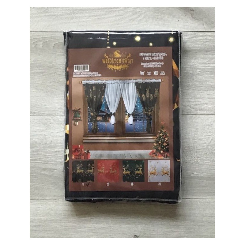 Firana gotowa z białego woalu z czarnym materiałem we wzór świąteczny. Składa się z czterech kokonów (dwóch zasłonek i dwóch firanek) ,spiętych kokardami na rzep. Firanka stanowi jeden element.