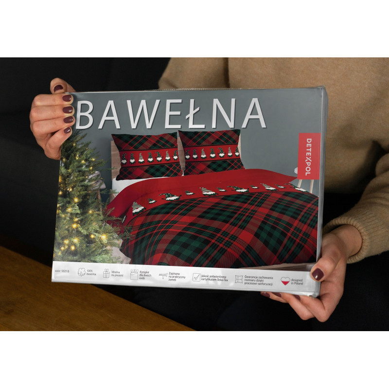 Pościel Detexpol 100% Bawełna 220x200 3cz Święta Krata Skrzaty 5821B Czerwona