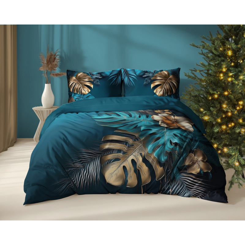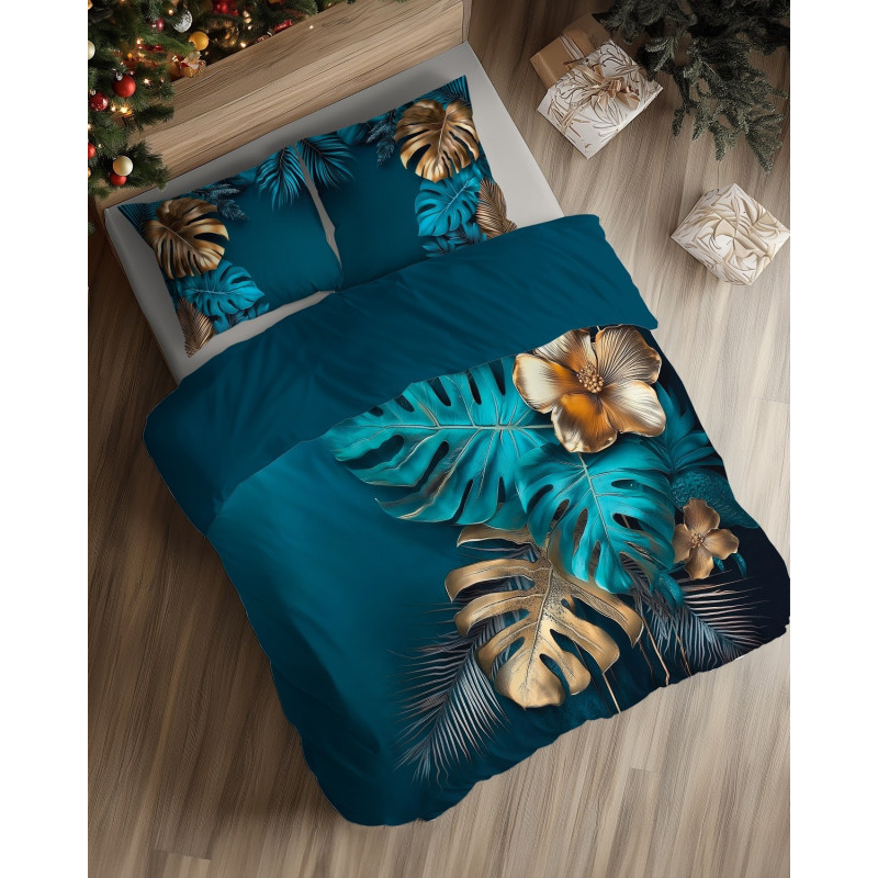 Pościel Holland 100% Bawełna 160x200 3cz Liście Monster Niebiesko Złote