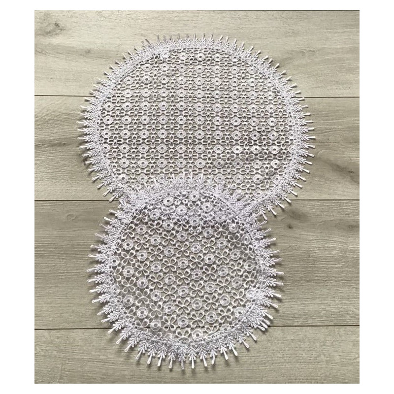 Piękne okrągłe białe serwetki całe z gipiury koronkowej.