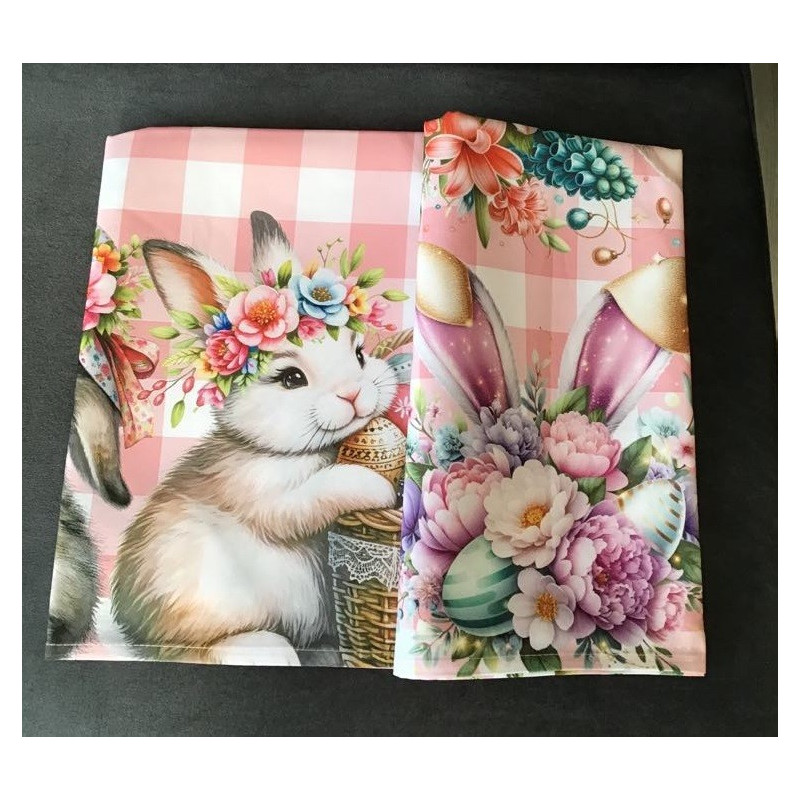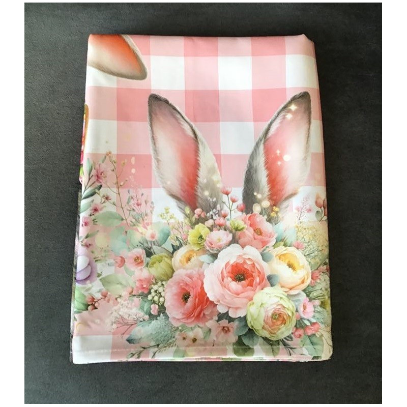 Elegancki obrus starannie wykonany z tkaniny poliestrowej w biało różaową kratę , nadrukowanej pięknym ,wyraźnym ,kolorowym wzorem Wielkanocnym.