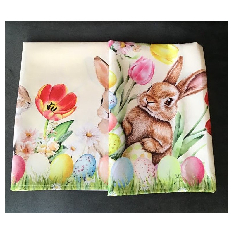 Elegancki obrus starannie wykonany z tkaniny poliestrowej koloru kremowego , nadrukowanej pięknym ,wyraźnym ,kolorowym wzorem Wielkanocnym.