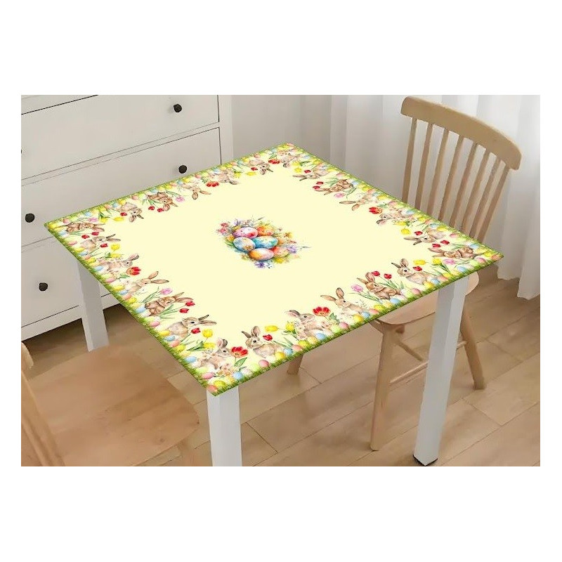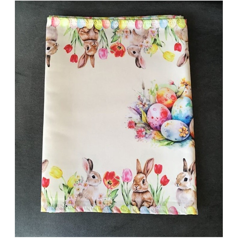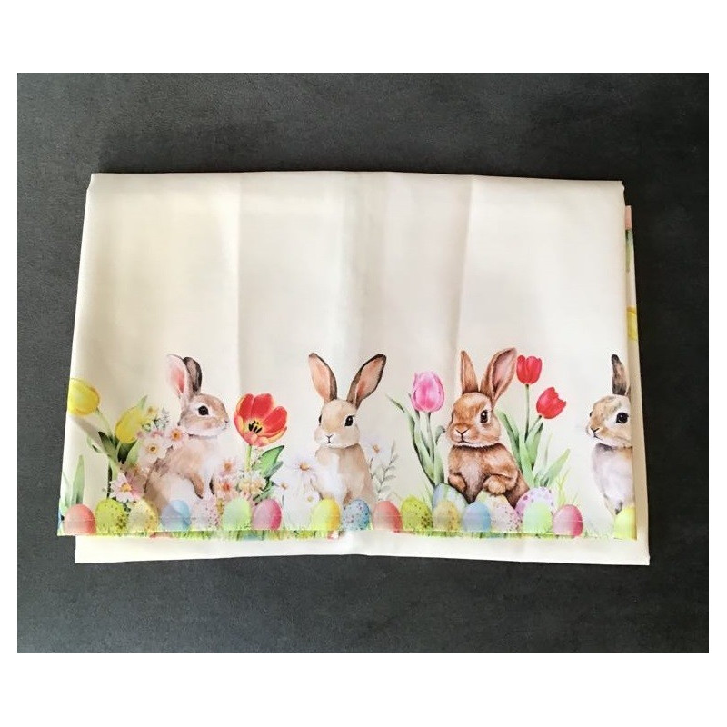 Elegancki obrus starannie wykonany z tkaniny poliestrowej kremowej , nadrukowanej pięknym ,wyraźnym ,kolorowym wzorem Wielkanocnym.