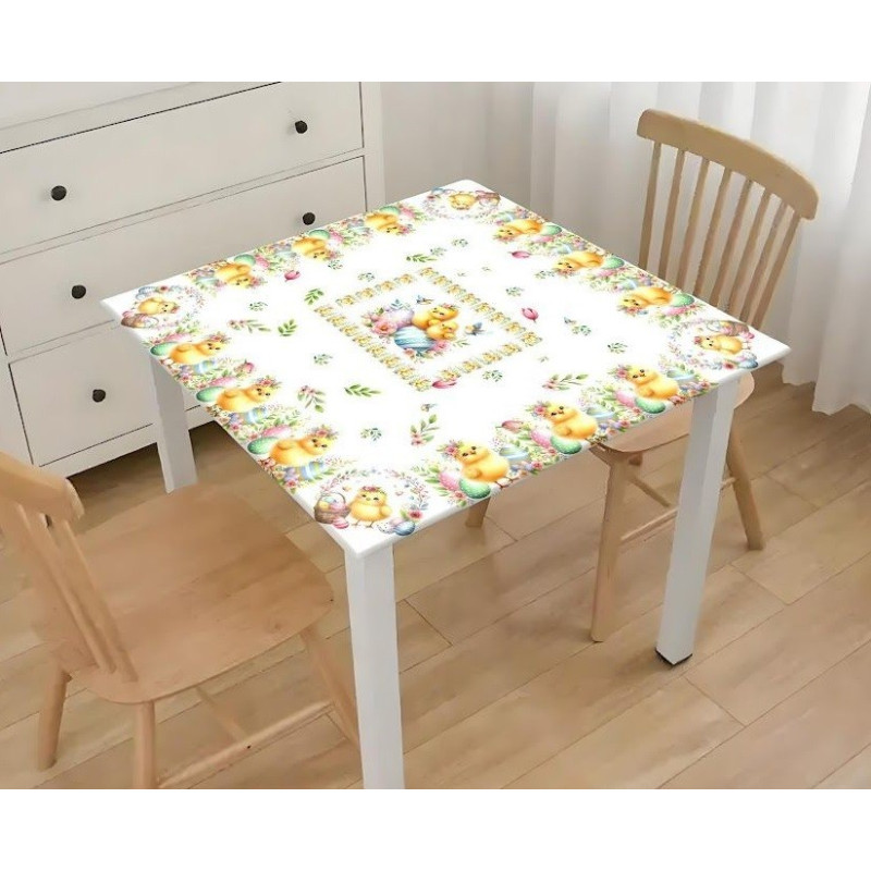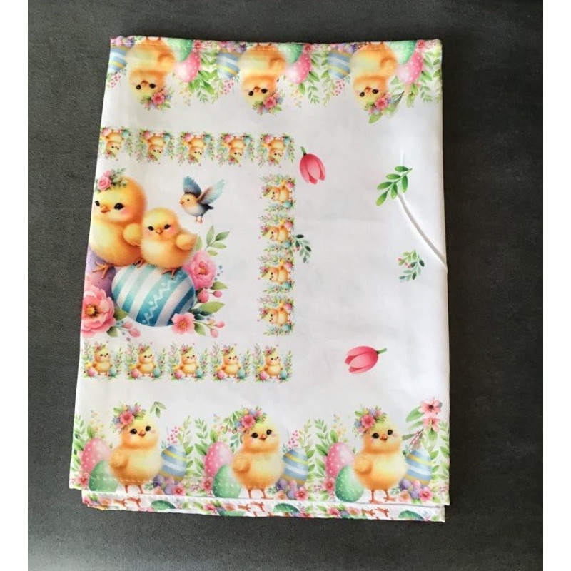 Elegancki obrus starannie wykonany z białej tkaniny poliestrowej  , nadrukowanej pięknym ,wyraźnym ,kolorowym wzorem Wielkanocnym.